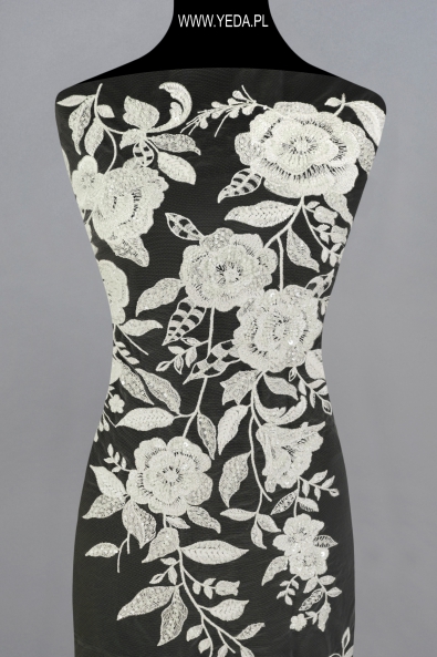 Verzierte Spitze von hoher Qualität, die sich durch originelles Muster und dekorative Details auszeichnet. Geschaffen mit dem Gedanken an anspruchsvollste Frauen, die auf eine einmalige und effektvolle Stilisierung Wert legen. Die vorgestellte Spitze wird sich als Basis einer Hochzeits- oder Abendkreation bewähren. Ihre Schönheit verdankt sie den darin enthaltenen Details. Sie spiegeln das Licht wider und erhellen den Stoff, wodurch sie zum Hingucker werden.
