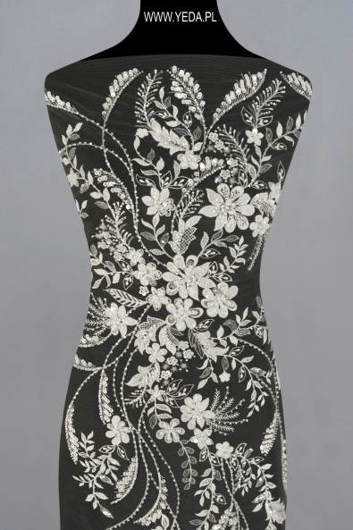 Verzierte Spitze von hoher Qualität, die sich durch originelles Muster und dekorative Details auszeichnet. Geschaffen mit dem Gedanken an anspruchsvollste Frauen, die auf eine einmalige und effektvolle Stilisierung Wert legen. Die vorgestellte Spitze wird sich als Basis einer Hochzeits- oder Abendkreation bewähren. Ihre Schönheit verdankt sie den darin enthaltenen Details. Sie spiegeln das Licht wider und erhellen den Stoff, wodurch sie zum Hingucker werden.