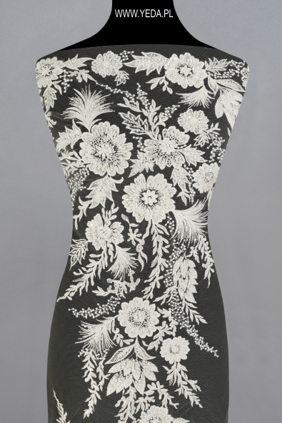 Verzierte Spitze von hoher Qualität, die sich durch originelles Muster und dekorative Details auszeichnet. Geschaffen mit dem Gedanken an anspruchsvollste Frauen, die auf eine einmalige und effektvolle Stilisierung Wert legen. Die vorgestellte Spitze wird sich als Basis einer Hochzeits- oder Abendkreation bewähren. Ihre Schönheit verdankt sie den darin enthaltenen Details. Sie spiegeln das Licht wider und erhellen den Stoff, wodurch sie zum Hingucker werden.