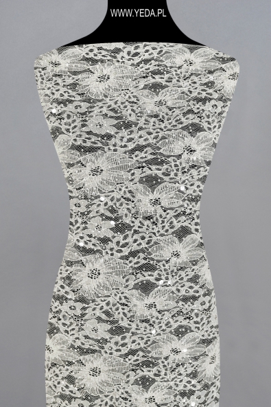 Verzierte Spitze von hoher Qualität, die sich durch originelles Muster und dekorative Details auszeichnet. Geschaffen mit dem Gedanken an anspruchsvollste Frauen, die auf eine einmalige und effektvolle Stilisierung Wert legen. Die vorgestellte Spitze wird sich als Basis einer Hochzeits- oder Abendkreation bewähren. Ihre Schönheit verdankt sie den darin enthaltenen Details. Sie spiegeln das Licht wider und erhellen den Stoff, wodurch sie zum Hingucker werden.