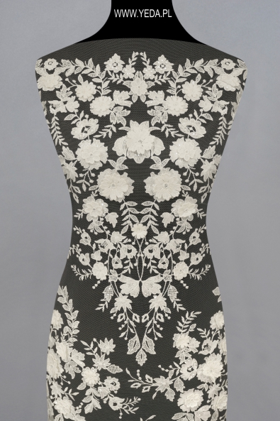 Verzierte Spitze von hoher Qualität, die sich durch originelles Muster und dekorative Details auszeichnet. Geschaffen mit dem Gedanken an anspruchsvollste Frauen, die auf eine einmalige und effektvolle Stilisierung Wert legen. Die vorgestellte Spitze wird sich als Basis einer Hochzeits- oder Abendkreation bewähren. Ihre Schönheit verdankt sie den darin enthaltenen Details. Sie spiegeln das Licht wider und erhellen den Stoff, wodurch sie zum Hingucker werden.