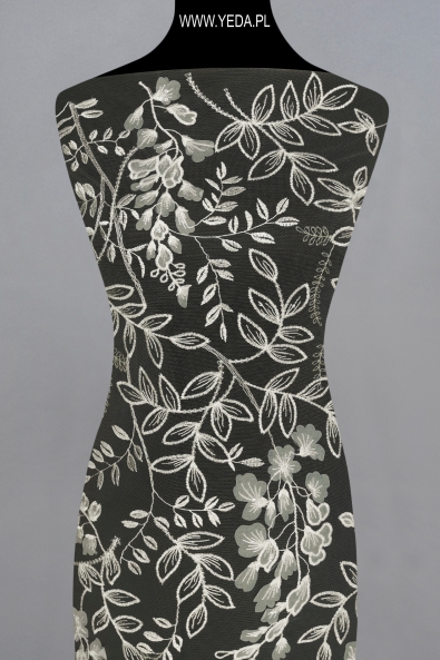Verzierte Spitze von hoher Qualität, die sich durch originelles Muster und dekorative Details auszeichnet. Geschaffen mit dem Gedanken an anspruchsvollste Frauen, die auf eine einmalige und effektvolle Stilisierung Wert legen. Die vorgestellte Spitze wird sich als Basis einer Hochzeits- oder Abendkreation bewähren. Ihre Schönheit verdankt sie den darin enthaltenen Details. Sie spiegeln das Licht wider und erhellen den Stoff, wodurch sie zum Hingucker werden.