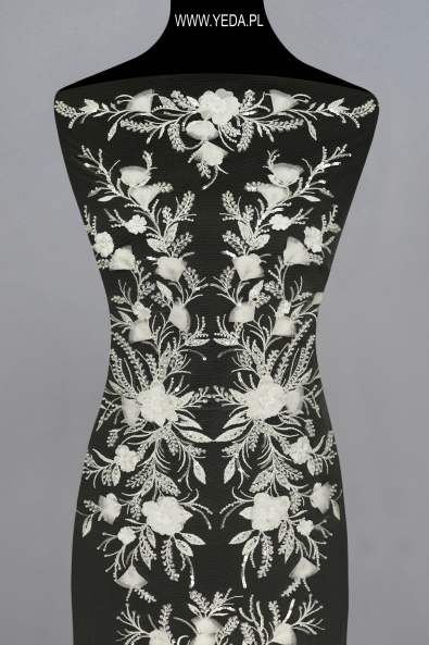 Verzierte Spitze von hoher Qualität, die sich durch originelles Muster und dekorative Details auszeichnet. Geschaffen mit dem Gedanken an anspruchsvollste Frauen, die auf eine einmalige und effektvolle Stilisierung Wert legen. Die vorgestellte Spitze wird sich als Basis einer Hochzeits- oder Abendkreation bewähren. Ihre Schönheit verdankt sie den darin enthaltenen Details. Sie spiegeln das Licht wider und erhellen den Stoff, wodurch sie zum Hingucker werden.