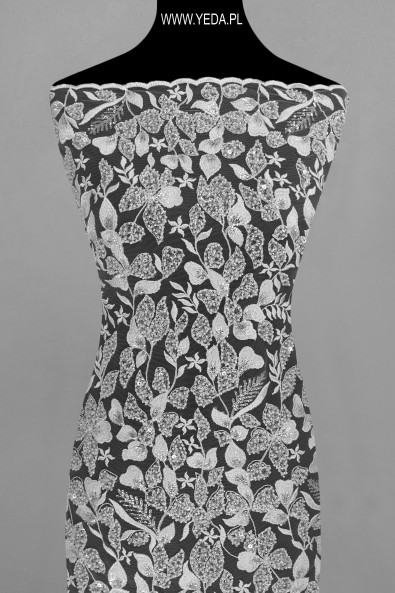 High-quality embellished lace with a unique pattern and decorative details. It was created for the most demanding women who want to achieve unique and effective styling. The presented lace will be perfect as a base for a wedding or evening creation. It owes its charm to the details on it. They reflect light and illuminate the material, and consequently catch the eye.