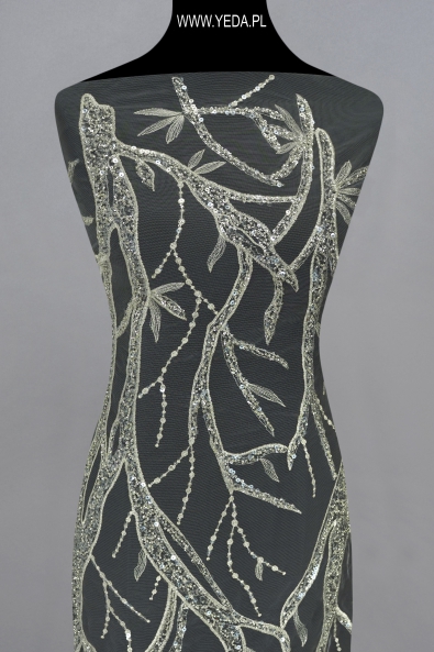 High-quality decorated evening lace created for women who value elegance. The unique pattern was embroidered on tulle and then decorated with spectacular details. This type of material catches the eye and gives the user a seductive character. Such lace is the basis of a classic evening or cocktail dress.
