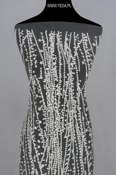High-quality embellished lace with a unique pattern and decorative details. It was created for the most demanding women who want to achieve unique and effective styling. The presented lace will be perfect as a base for a wedding or evening creation. It owes its charm to the details on it. They reflect light and illuminate the material, and consequently catch the eye.