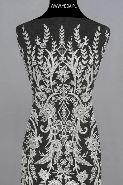 High-quality embellished lace with a unique pattern and decorative details. It was created for the most demanding women who want to achieve unique and effective styling. The presented lace will be perfect as a base for a wedding or evening creation. It owes its charm to the details on it. They reflect light and illuminate the material, and consequently catch the eye.