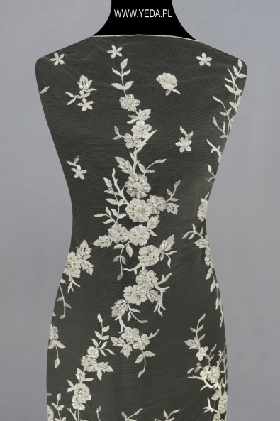 High-quality embellished lace with a unique pattern and decorative details. It was created for the most demanding women who want to achieve unique and effective styling. The presented lace will be perfect as a base for a wedding or evening creation. It owes its charm to the details on it. They reflect light and illuminate the material, and consequently catch the eye.