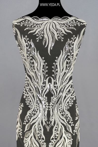 High-quality embellished lace with a unique pattern and decorative details. It was created for the most demanding women who want to achieve unique and effective styling. The presented lace will be perfect as a base for a wedding or evening creation. It owes its charm to the details on it. They reflect light and illuminate the material, and consequently catch the eye.