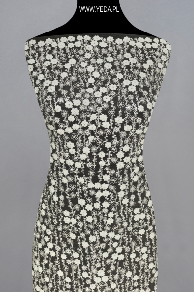 High-quality embellished lace with a unique pattern and decorative details. It was created for the most demanding women who want to achieve unique and effective styling. The presented lace will be perfect as a base for a wedding or evening creation. It owes its charm to the details on it. They reflect light and illuminate the material, and consequently catch the eye.
