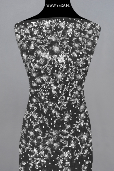 High-quality embellished lace with a unique pattern and decorative details. It was created for the most demanding women who want to achieve unique and effective styling. The presented lace will be perfect as a base for a wedding or evening creation. It owes its charm to the details on it. They reflect light and illuminate the material, and consequently catch the eye.
