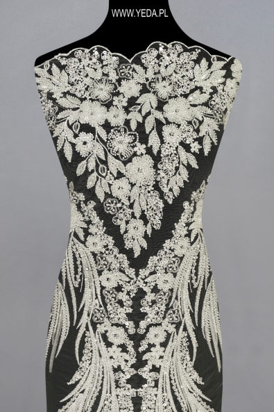 High-quality embellished lace with a unique pattern and decorative details. It was created for the most demanding women who want to achieve unique and effective styling. The presented lace will be perfect as a base for a wedding or evening creation. It owes its charm to the details on it. They reflect light and illuminate the material, and consequently catch the eye.