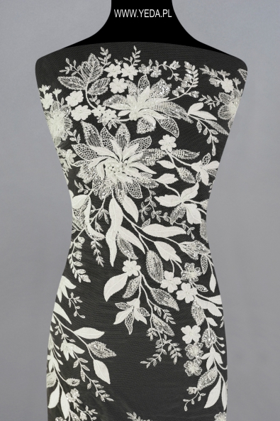 High-quality embellished lace with a unique pattern and decorative details. It was created for the most demanding women who want to achieve unique and effective styling. The presented lace will be perfect as a base for a wedding or evening creation. It owes its charm to the details on it. They reflect light and illuminate the material, and consequently catch the eye.