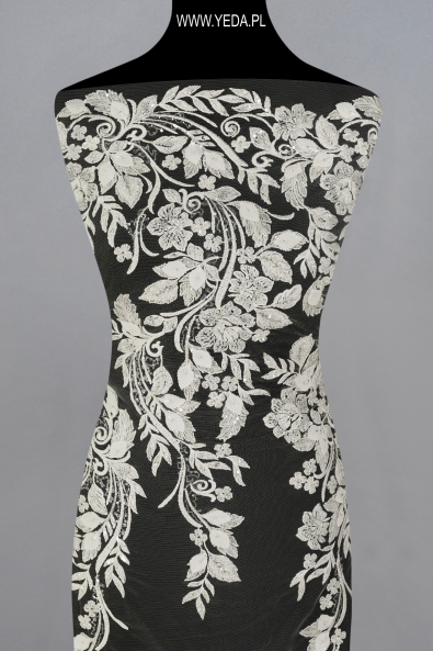 High-quality embellished lace with a unique pattern and decorative details. It was created for the most demanding women who want to achieve unique and effective styling. The presented lace will be perfect as a base for a wedding or evening creation. It owes its charm to the details on it. They reflect light and illuminate the material, and consequently catch the eye.