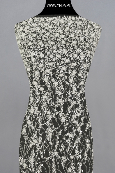 High-quality embellished lace with a unique pattern and decorative details. It was created for the most demanding women who want to achieve unique and effective styling. The presented lace will be perfect as a base for a wedding or evening creation. It owes its charm to the details on it. They reflect light and illuminate the material, and consequently catch the eye.