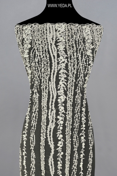 High-quality embellished lace with a unique pattern and decorative details. It was created for the most demanding women who want to achieve unique and effective styling. The presented lace will be perfect as a base for a wedding or evening creation. It owes its charm to the details on it. They reflect light and illuminate the material, and consequently catch the eye.