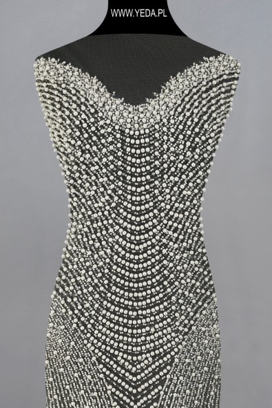 High-quality embellished lace with a unique pattern and decorative details. It was created for the most demanding women who want to achieve unique and effective styling. The presented lace will be perfect as a base for a wedding or evening creation. It owes its charm to the details on it. They reflect light and illuminate the material, and consequently catch the eye.