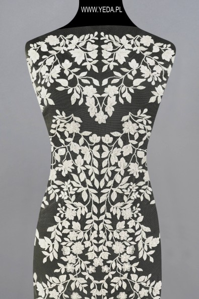High-quality embellished lace with a unique pattern and decorative details. It was created for the most demanding women who want to achieve unique and effective styling. The presented lace will be perfect as a base for a wedding or evening creation. It owes its charm to the details on it. They reflect light and illuminate the material, and consequently catch the eye.