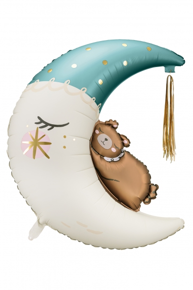 Foil balloon Teddy on the moon, mix of colors with a light blue element and a gold tassel, dimensions before inflating approx. 80 x 98 cm (31.5 x 38.5''), dimensions after inflating approx. 71 x 86 cm (28 x 34''). Can be inflated with air or helium. The set includes a straw and a gold tassel.