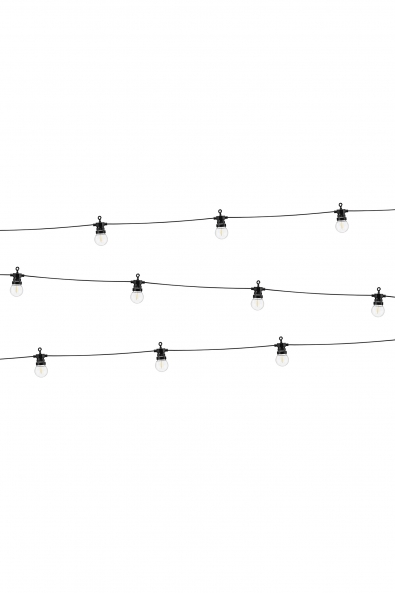 Retro Decorative LED Lights, clear bulbs on a black wire, wire length with lights approx. 5 m, additional wire approx. 3 m, 10 round bulbs, light color warm yellow, suitable for both indoor and outdoor use. Can be connected to a maximum of 5 sets of lights. Rated voltage: 24V; Rated power: 8.4W; Bulb power: 20mA, 24V; 2200K.