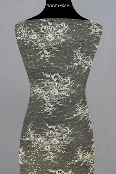 High-quality embellished lace with a unique pattern and decorative details. It was created for the most demanding women who want to achieve unique and effective styling. The presented lace will be perfect as a base for a wedding or evening creation. It owes its charm to the details on it. They reflect light and illuminate the material, and consequently catch the eye.