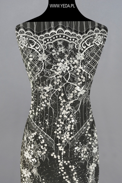 High-quality embellished lace with a unique pattern and decorative details. It was created for the most demanding women who want to achieve unique and effective styling. The presented lace will be perfect as a base for a wedding or evening creation. It owes its charm to the details on it. They reflect light and illuminate the material, and consequently catch the eye.