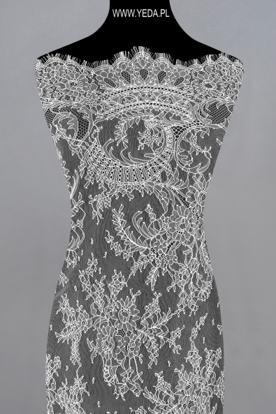 Feminine and elegant not embellished lace with the highest quality. The unique pattern makes this material ideally suited as a part of a cocktail, evening, or even wedding creation. The main aesthetic value of this product is just the mentioned pattern, because no additional decorations appear on the lace. This material is perfect for women who value classic style and subtle elegance.