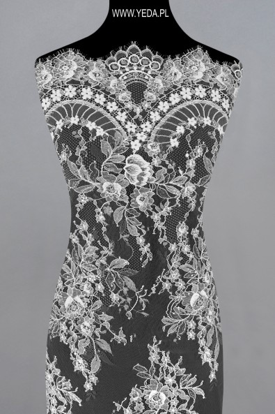 High-quality embellished lace with a unique pattern and decorative details. It was created for the most demanding women who want to achieve unique and effective styling. The presented lace will be perfect as a base for a wedding or evening creation. It owes its charm to the details on it. They reflect light and illuminate the material, and consequently catch the eye.