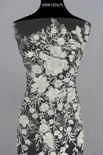 High-quality embellished lace with a unique pattern and decorative details. It was created for the most demanding women who want to achieve unique and effective styling. The presented lace will be perfect as a base for a wedding or evening creation. It owes its charm to the details on it. They reflect light and illuminate the material, and consequently catch the eye.
