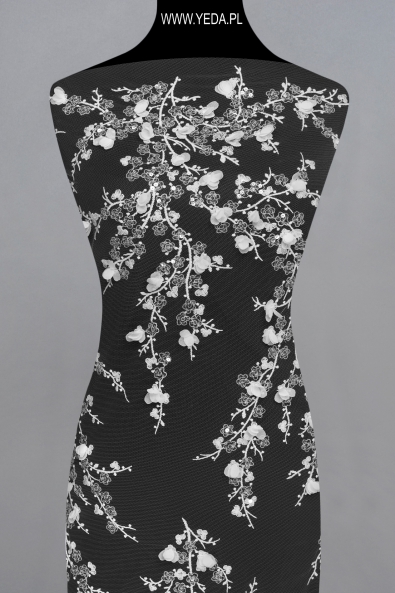 High-quality embellished lace with a unique pattern and decorative details. It was created for the most demanding women who want to achieve unique and effective styling. The presented lace will be perfect as a base for a wedding or evening creation. It owes its charm to the details on it. They reflect light and illuminate the material, and consequently catch the eye.