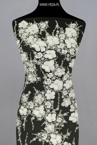 High-quality embellished lace with a unique pattern and decorative details. It was created for the most demanding women who want to achieve unique and effective styling. The presented lace will be perfect as a base for a wedding or evening creation. It owes its charm to the details on it. They reflect light and illuminate the material, and consequently catch the eye.