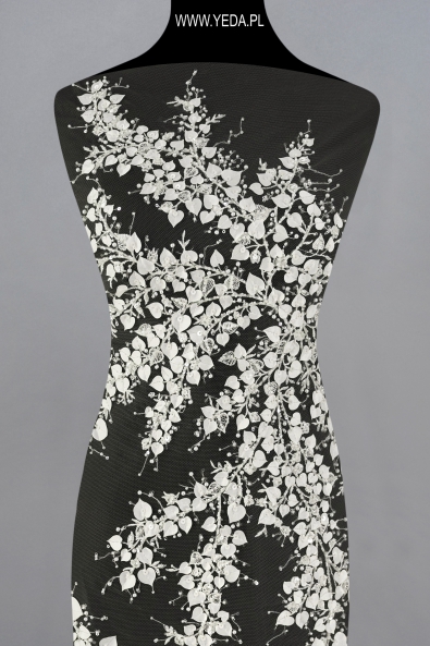 High-quality embellished lace with a unique pattern and decorative details. It was created for the most demanding women who want to achieve unique and effective styling. The presented lace will be perfect as a base for a wedding or evening creation. It owes its charm to the details on it. They reflect light and illuminate the material, and consequently catch the eye.