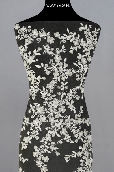 High-quality embellished lace with a unique pattern and decorative details. It was created for the most demanding women who want to achieve unique and effective styling. The presented lace will be perfect as a base for a wedding or evening creation. It owes its charm to the details on it. They reflect light and illuminate the material, and consequently catch the eye.