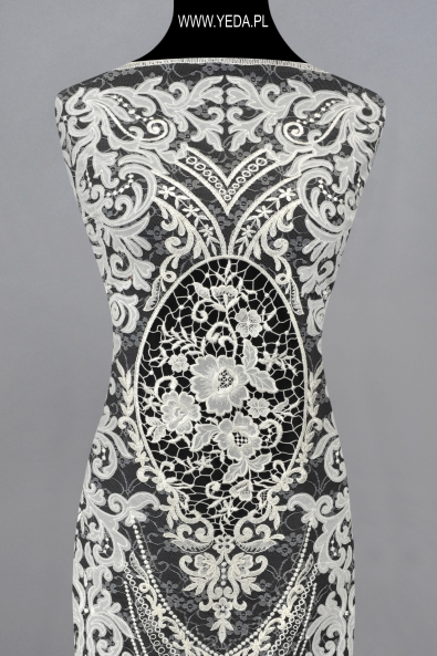 Beautiful decorated lace embroidered on delicate, slightly stretchy tulle. Ideally suited for creating a unique wedding or communion dress.