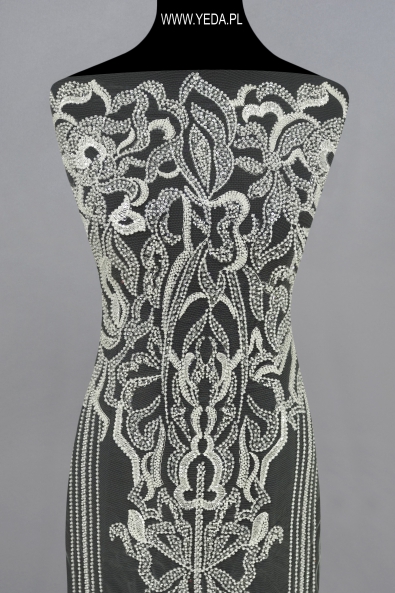 High-quality embellished lace with a unique pattern and decorative details. It was created for the most demanding women who want to achieve unique and effective styling. The presented lace will be perfect as a base for a wedding or evening creation. It owes its charm to the details on it. They reflect light and illuminate the material, and consequently catch the eye.
