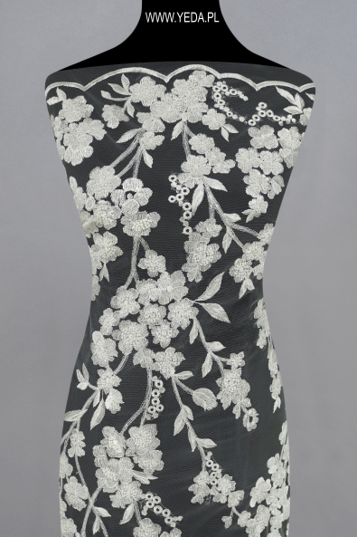 High-quality embellished lace with a unique pattern and decorative details. It was created for the most demanding women who want to achieve unique and effective styling. The presented lace will be perfect as a base for a wedding or evening creation. It owes its charm to the details on it. They reflect light and illuminate the material, and consequently catch the eye.