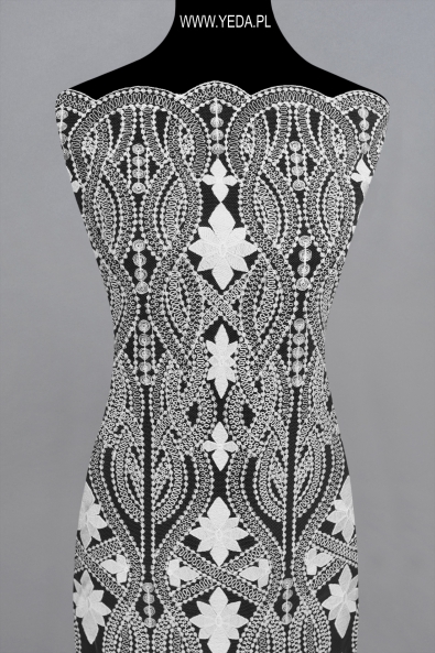 Feminine and elegant not embellished lace with the highest quality. The unique pattern makes this material ideally suited as a part of a cocktail, evening, or even wedding creation. The main aesthetic value of this product is just the mentioned pattern, because no additional decorations appear on the lace. This material is perfect for women who value classic style and subtle elegance.