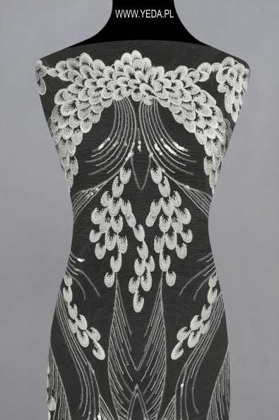High-quality embellished lace with a unique pattern and decorative details. It was created for the most demanding women who want to achieve unique and effective styling. The presented lace will be perfect as a base for a wedding or evening creation. It owes its charm to the details on it. They reflect light and illuminate the material, and consequently catch the eye.