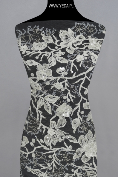 High-quality embellished lace with a unique pattern and decorative details. It was created for the most demanding women who want to achieve unique and effective styling. The presented lace will be perfect as a base for a wedding or evening creation. It owes its charm to the details on it. They reflect light and illuminate the material, and consequently catch the eye.