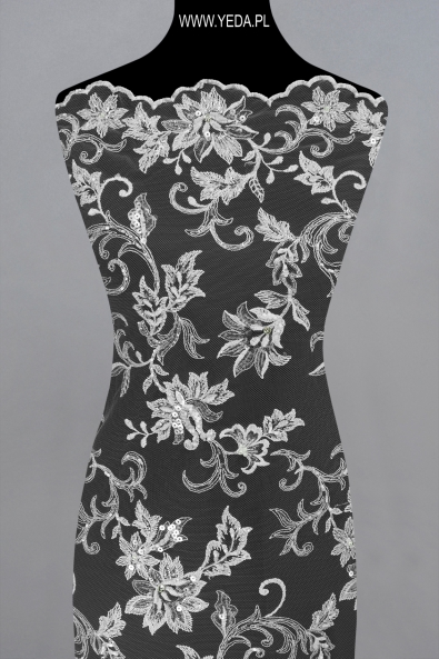 High-quality embellished lace with a unique pattern and decorative details. It was created for the most demanding women who want to achieve unique and effective styling. The presented lace will be perfect as a base for a wedding or evening creation. It owes its charm to the details on it. They reflect light and illuminate the material, and consequently catch the eye.