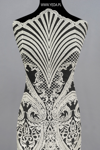 High-quality embellished lace with a unique pattern and decorative details. It was created for the most demanding women who want to achieve unique and effective styling. The presented lace will be perfect as a base for a wedding or evening creation. It owes its charm to the details on it. They reflect light and illuminate the material, and consequently catch the eye.