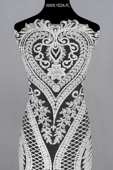 High-quality embellished lace with a unique pattern and decorative details. It was created for the most demanding women who want to achieve unique and effective styling. The presented lace will be perfect as a base for a wedding or evening creation. It owes its charm to the details on it. They reflect light and illuminate the material, and consequently catch the eye.