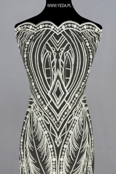 High-quality embellished lace with a unique pattern and decorative details. It was created for the most demanding women who want to achieve unique and effective styling. The presented lace will be perfect as a base for a wedding or evening creation. It owes its charm to the details on it. They reflect light and illuminate the material, and consequently catch the eye.