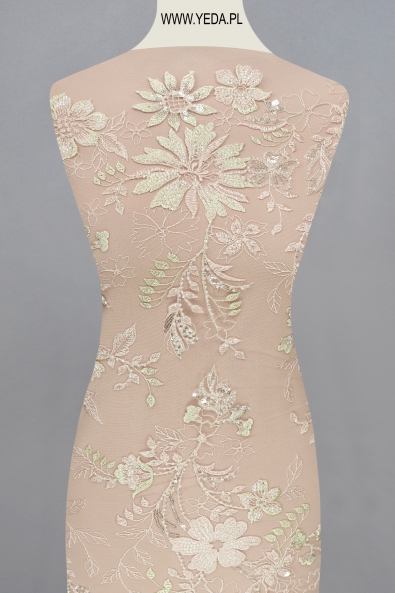 High-quality decorated evening lace created for women who value elegance. The unique pattern was embroidered on tulle and then decorated with spectacular details. This type of material catches the eye and gives the user a seductive character. Such lace is the basis of a classic evening or cocktail dress.