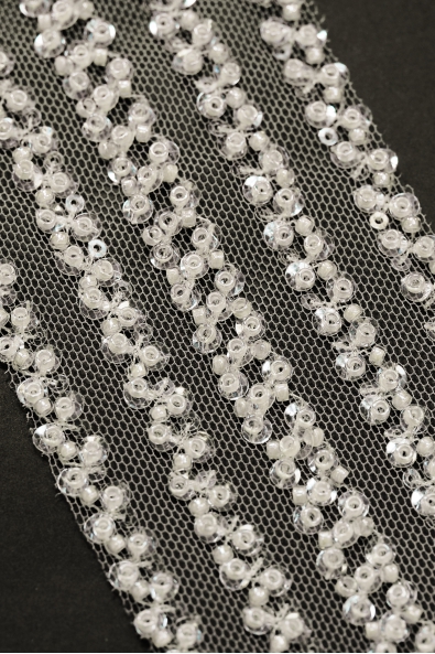 High quality decorated trim, created from extremely elegant lace. It delights with beautiful patterns and accessories that emphasize the charm of the fabric decorated with it. It is the perfect culmination of any wedding, evening or cocktail dress. This inconspicuous detail catches the eye and evokes admiration.
