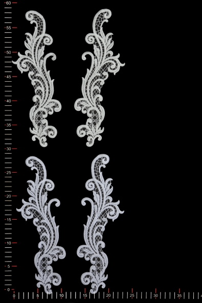 Wysokiej jakości aplikacja niezdobiona wykonana z gipiury. Wyróżnia się solidną formą, wyraźnym kształtem oraz szerokimi oczkami koronki. Naszyta na suknię ślubną, wieczorową czy koktajlową nadaje jej indywidualnego i niepowtarzalnego charakteru.