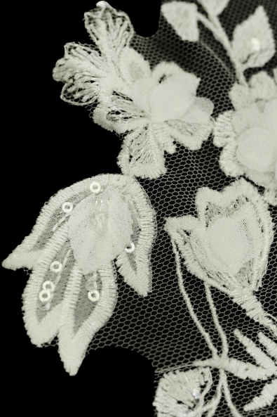 Aplikacja zdobiona,stworzona z eleganckiej koronki oraz niepowtarzalnych, rozświetlających naszywkę dodatków. Cały design produktu pozwala wykorzystać go jako wyjątkowy element dekoracyjny sukni wieczorowej, koktajlowej lub ślubnej.