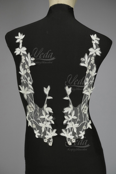 Aplikacja zdobiona, stworzona z eleganckiej koronki oraz niepowtarzalnych, rozświetlających naszywkę dodatków. Cały design produktu pozwala wykorzystać go jako wyjątkowy element dekoracyjny sukni wieczorowej, koktajlowej lub ślubnej.