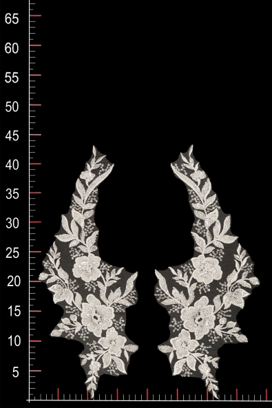 Aplikacja zdobiona, stworzona z eleganckiej koronki oraz niepowtarzalnych, rozświetlających naszywkę dodatków. Cały design produktu pozwala wykorzystać go jako wyjątkowy element dekoracyjny sukni wieczorowej, koktajlowej lub ślubnej.