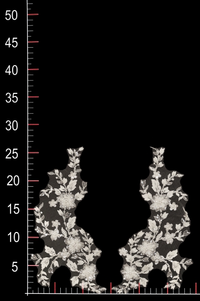 Aplikacja zdobiona, stworzona z eleganckiej koronki oraz niepowtarzalnych, rozświetlających naszywkę dodatków. Cały design produktu pozwala wykorzystać go jako wyjątkowy element dekoracyjny sukni wieczorowej, koktajlowej lub ślubnej.